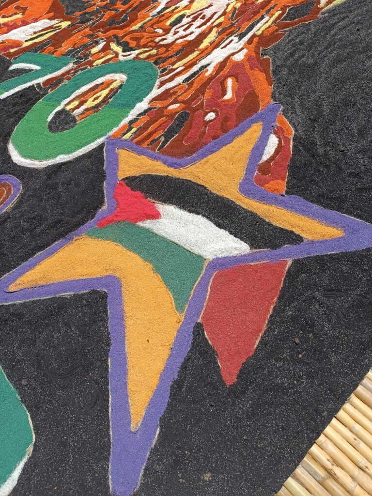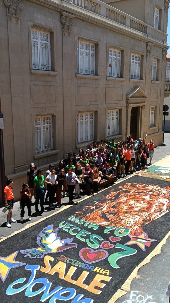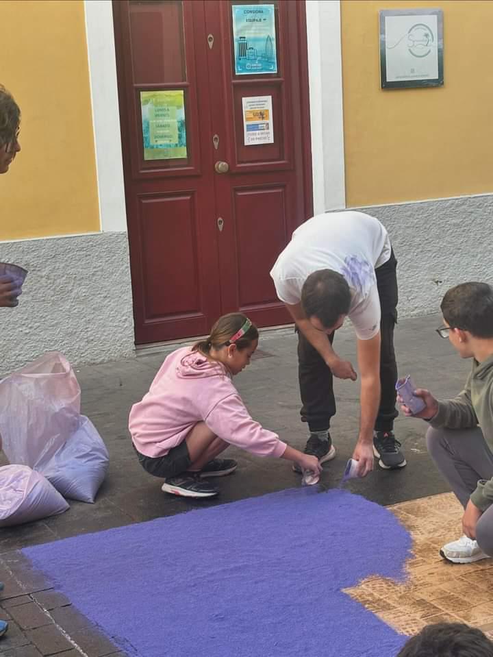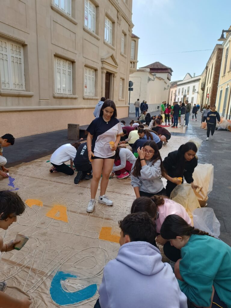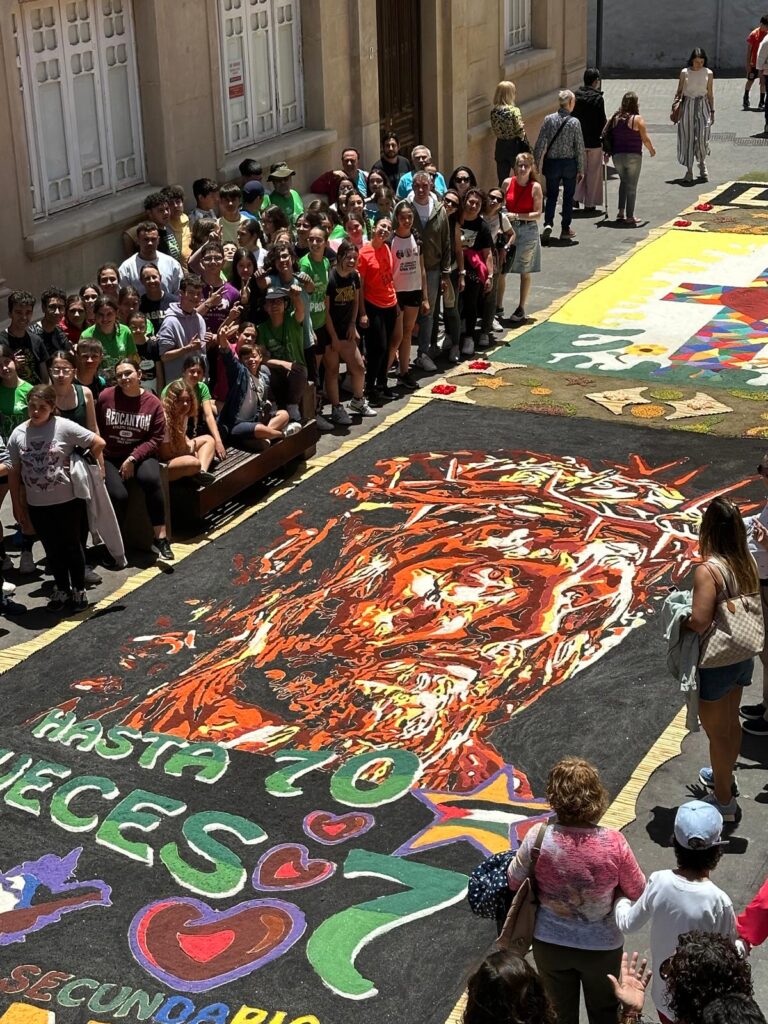 La aportación del voluntariado de PROYDE, del alumnado del centro, profesorado, familias, antiguos alumnos y de nuestra cofradía que se dieron cita a lo largo de la mañana hicieron posible la realización de esta alfombra nacida de un boceto elaborado por Carlos, profesor de Plástica del centro.
