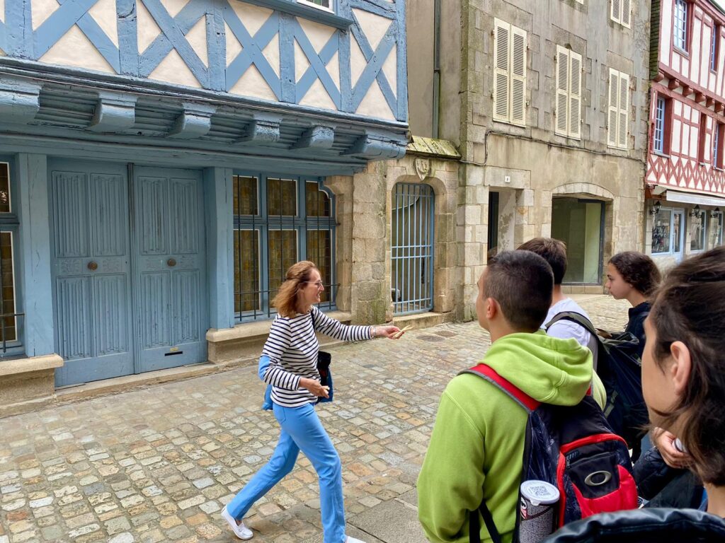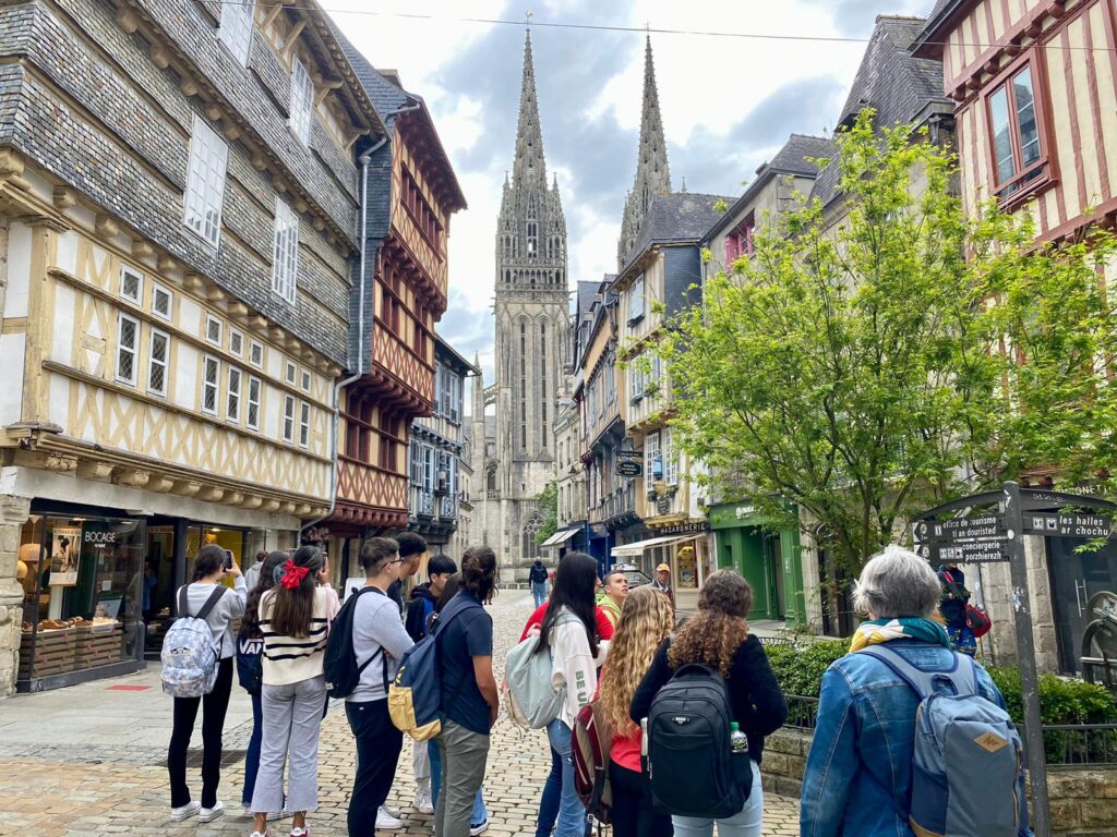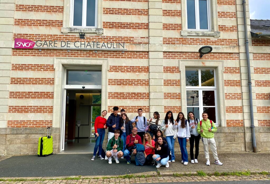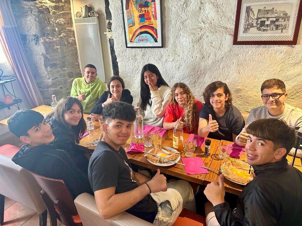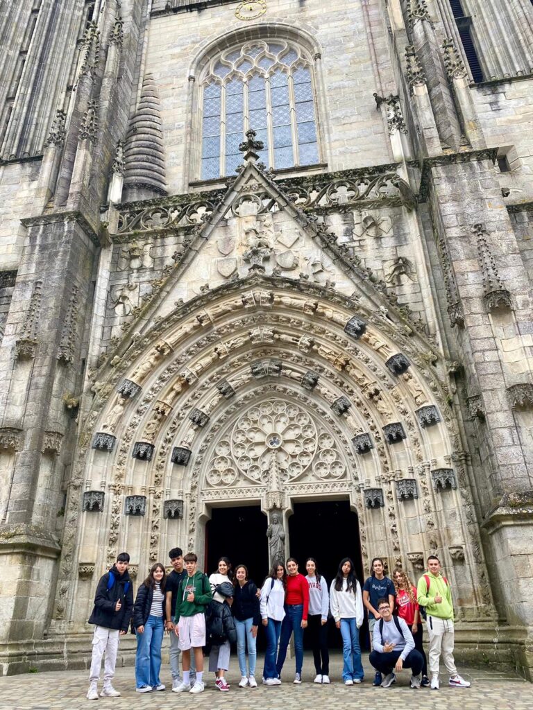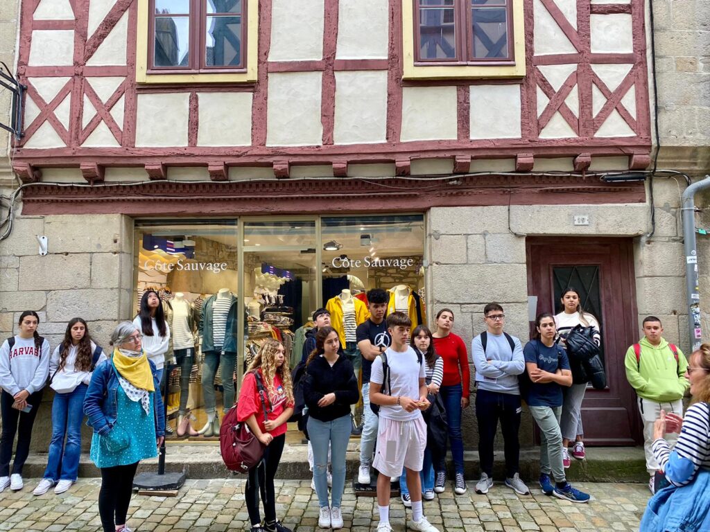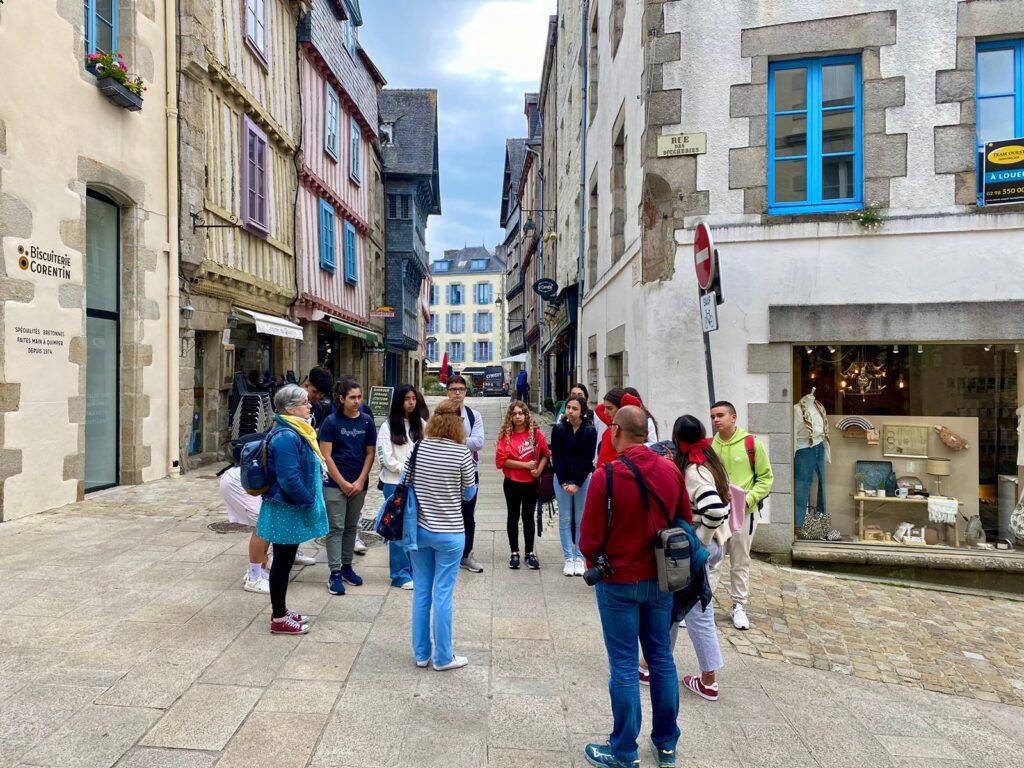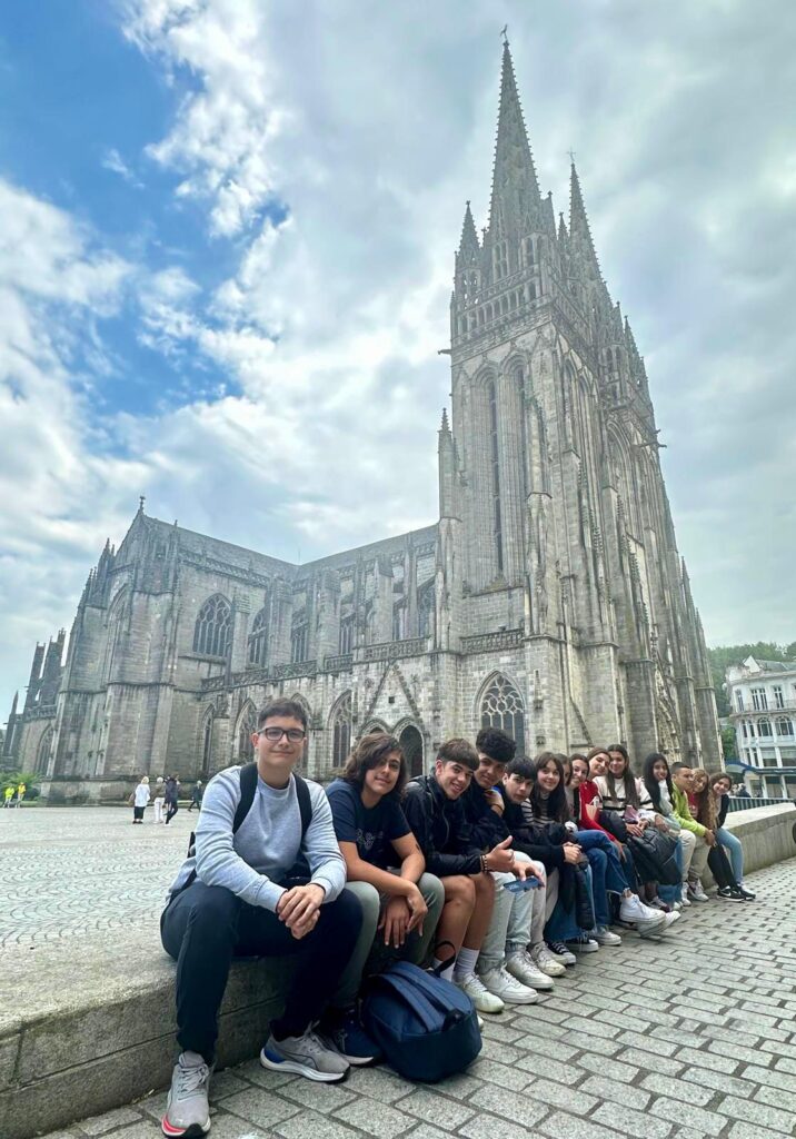 Coucou! Seguimos disfrutando de tierras bretonas. Hoy nos tocaba descubrir la ciudad de Quimper, ciudad de Arte e Historia, gracias a la calidad de su patrimonio arquitectónico. Empezamos la mañana a las 8:00 en el colegio, momento perfecto para ver las fotos de las caras que se nos habían quedado en las atracciones tuvimos un momento de encuentro con los profes y luego dirección a la estación de tren. Para muchos era nuestra primera vez en ir en tren así que imagínense la emoción. La experiencia fue muy guay, llegamos a Quimper y allí nos esperaba una guía muy agradable que nos descubrió los encantos del lugar. Después de la visita tocaba recargar fuerzas y fuimos a una crêperie, nos comimos una crêpe salada y otra dulce, estaban riquísimas Para finalizar nuestro día ,dimos un último paseo por la ciudad y de regreso en tren a encontrarnos con nuestros correspondants.