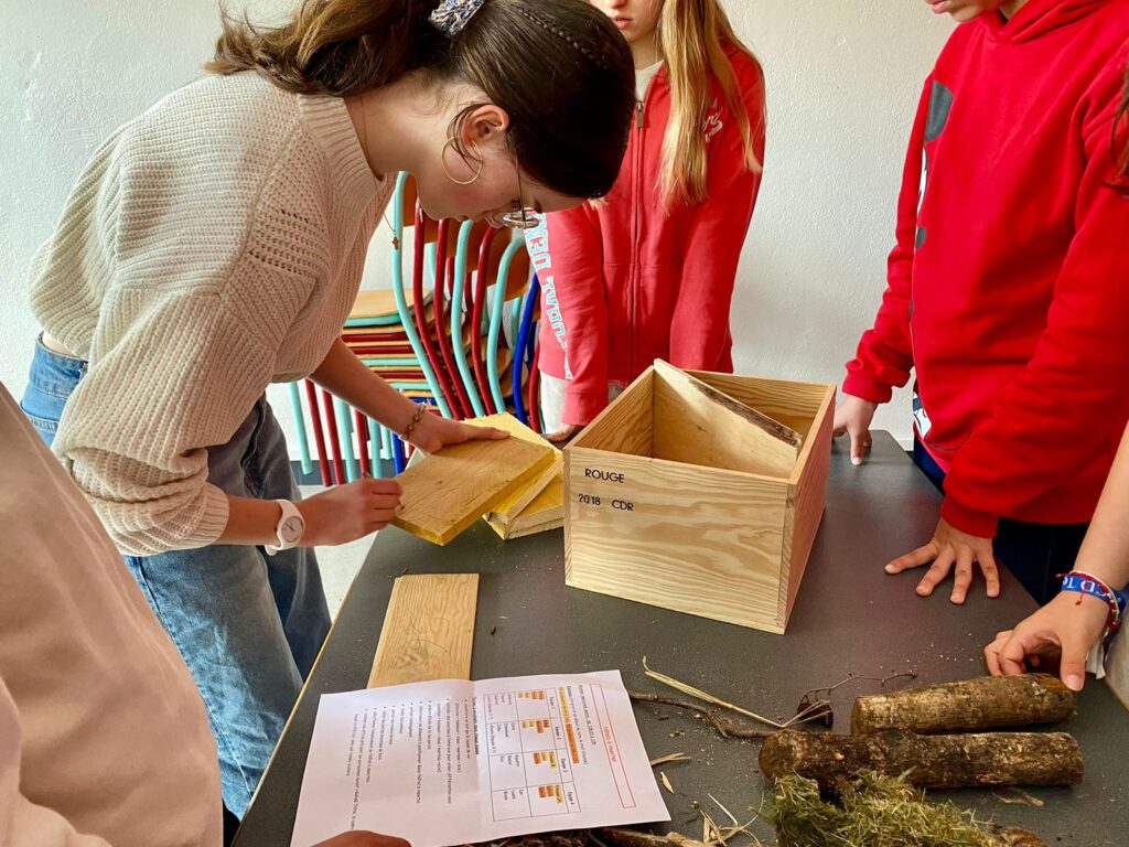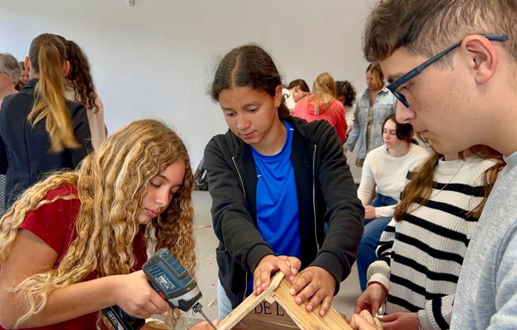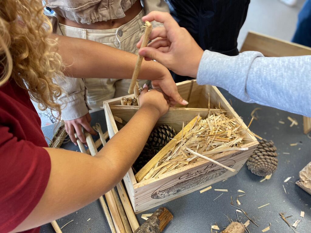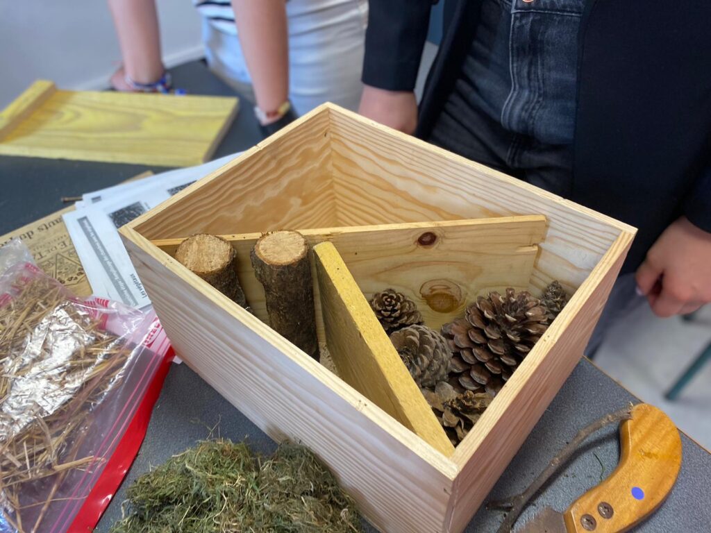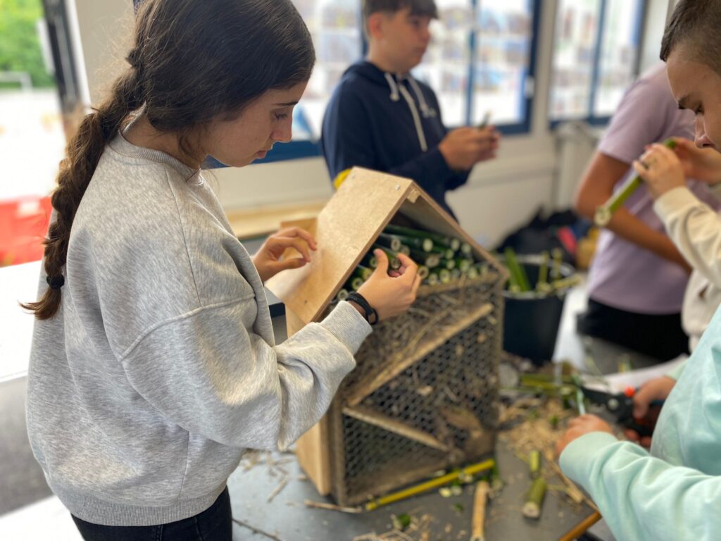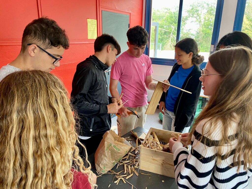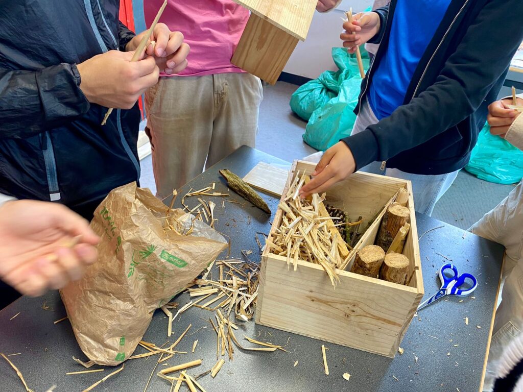 Tras una mañana de presentaciones tocaba ponernos manos a la obra, así que empezamos con la construcción de hoteles para insectos, uno de los proyectos del cole para facilitar la polinización de cultivos y el combate biológico de plagas.