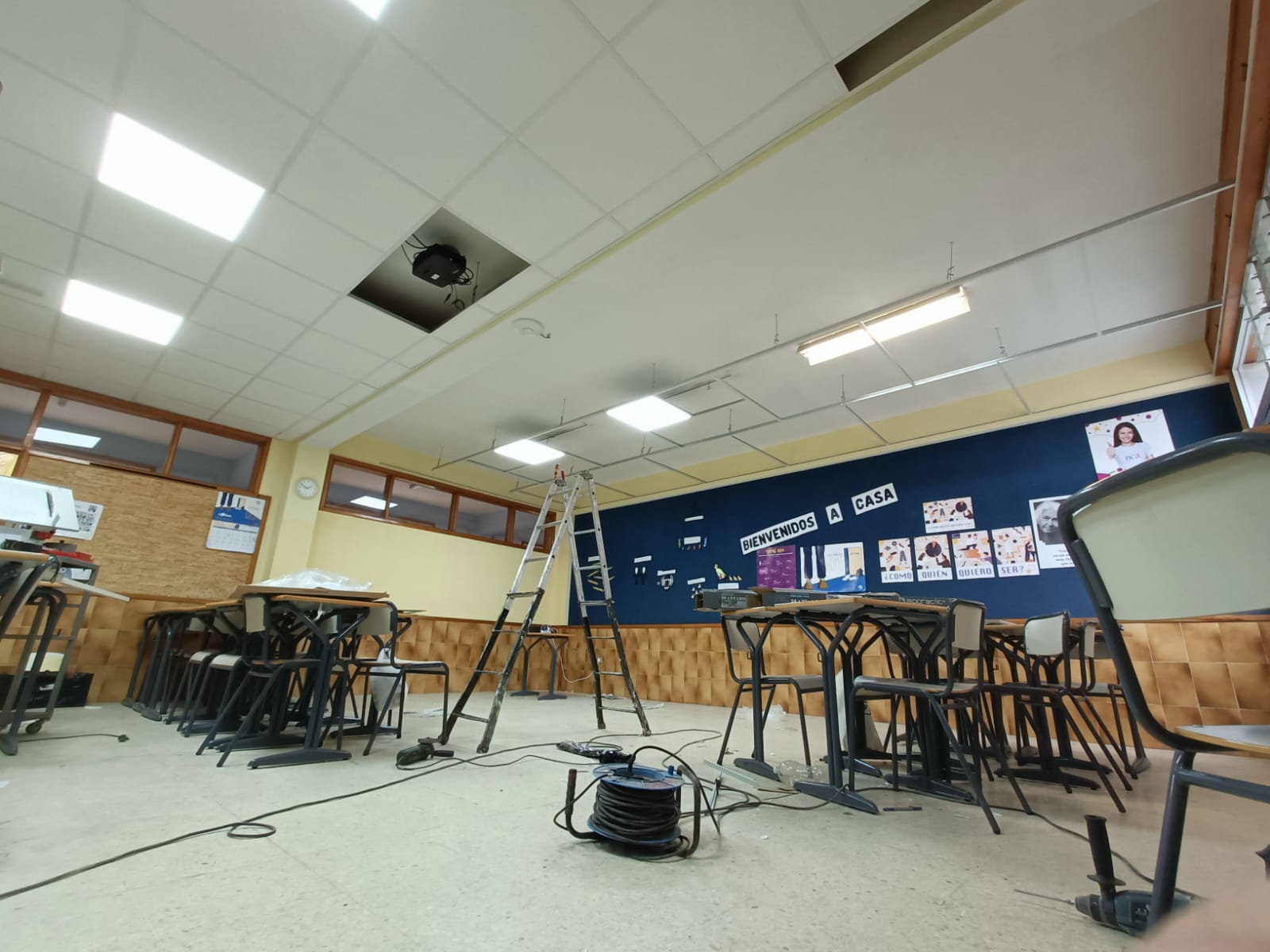 Además, la nuevo luminaria integrada en el techo, permite una mejora lumínica bastante notable, sustituyéndose la luz amarilla por luz fría blanca LED de última generación, que permite una mejor iluminación del aula y un espacio de estudio y trabajo más motivador y acondicionado.