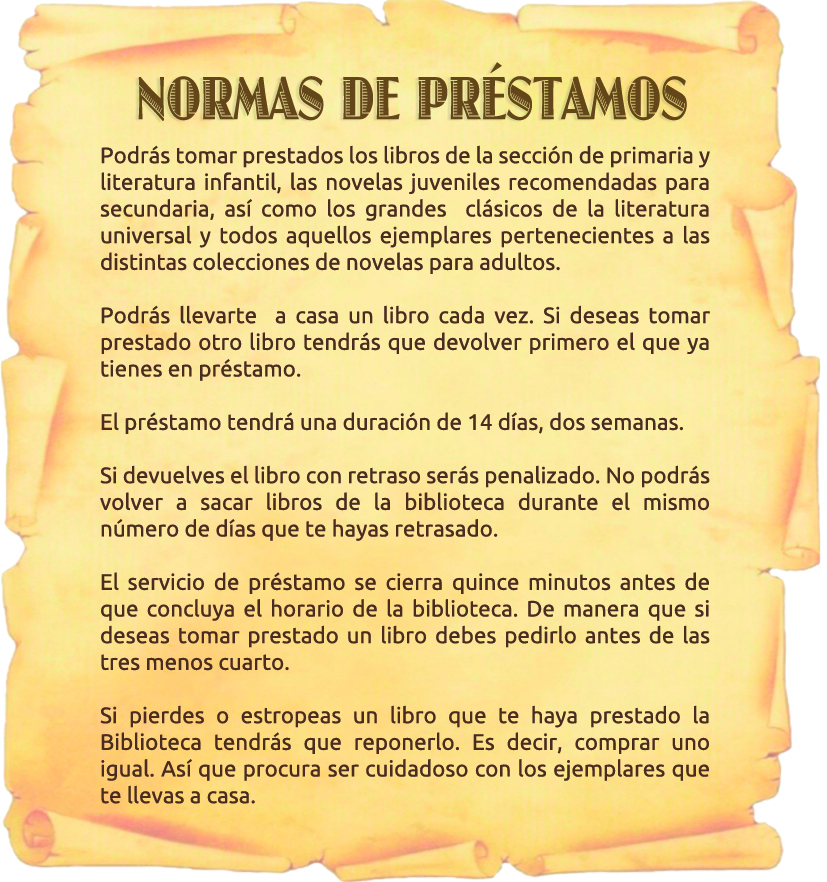 Una de las misiones más importantes de una biblioteca es difundir la lectura y para tal propósito nuestra biblioteca cuenta con el servicio de préstamos, tanto para el alumnado como para el profesorado; e incluso para padres y familiares de alumnos si así lo desean. Para ello también contamos con algunas normas que hacen posible llevar a cabo adecuadamente este servicio.