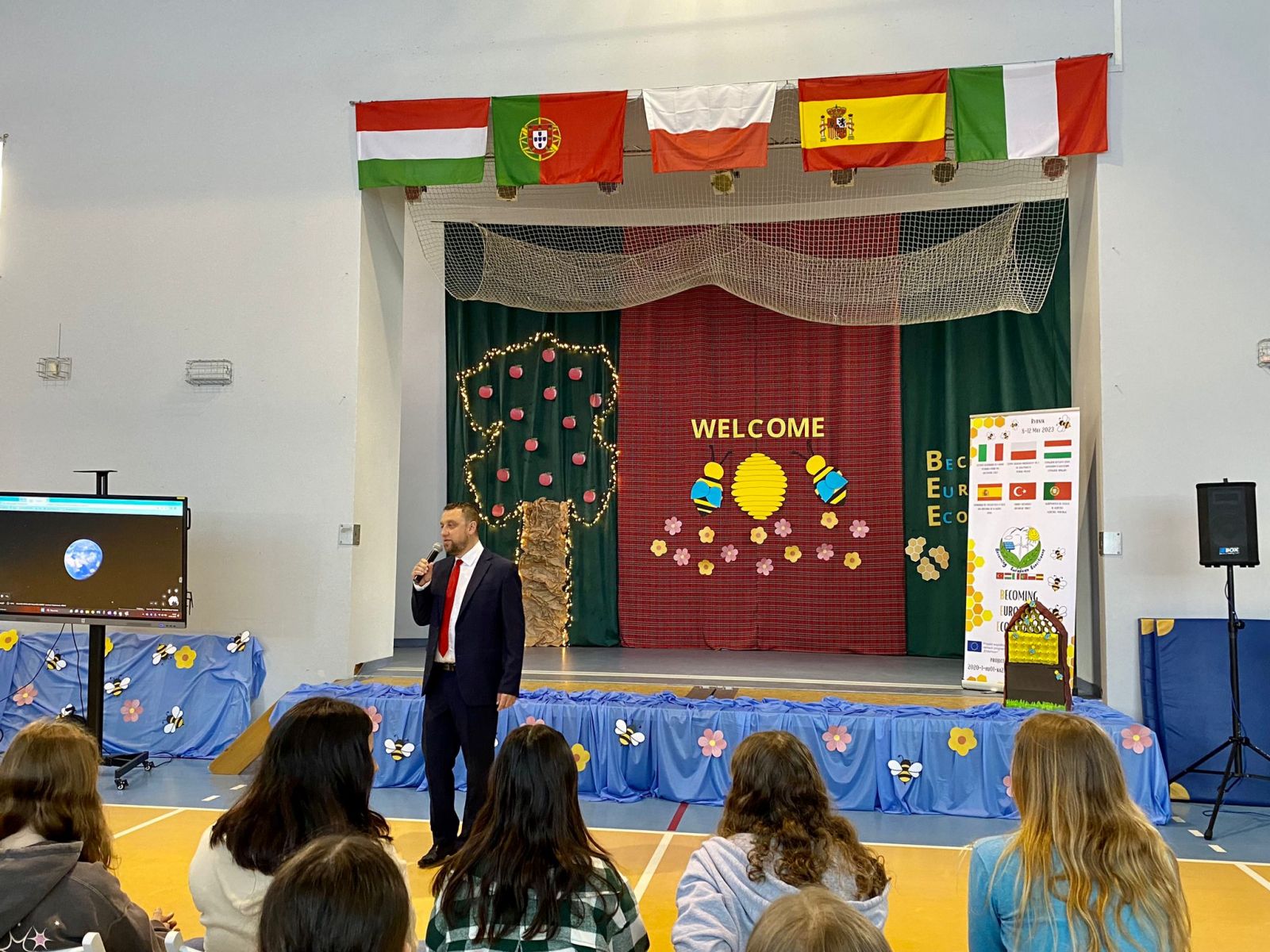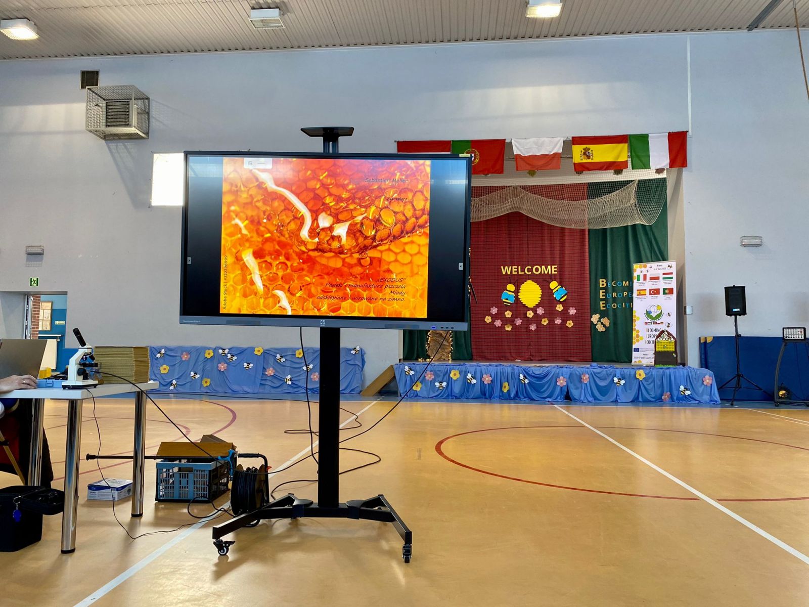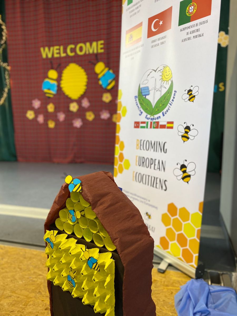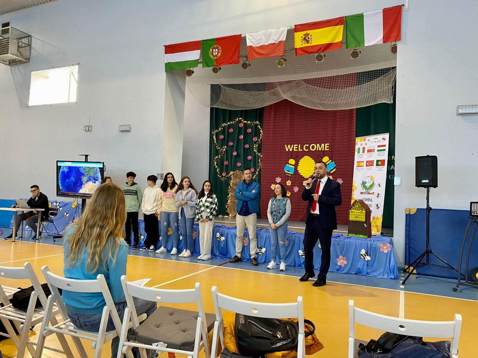 Durante esta primera mañana en el cole hemos realizado varias actividades: Empezamos con la bienvenida de todos los alumnos del centro , en este ratito compartido aprovechamos para realizar las presentaciones de los coles de Polonia, Hungría , Portugal y nosotros, por supuesto. Varios alumnos del centro se dividieron en grupos para presentarnos los diferentes espacios del lugar. Fue una visita muy entretenida e Interesante. Tras esta tuvimos una charla sobre abejas en la que descubrimos cosas muy interesantes sobre estos insectos que dan nombre a nuestro proyecto. Después de la presentación nos reunimos todos en el comedor y…¡a comer! Estaba todo delicioso Tras la comida, hemos pasado la tarde con nuestras familias para hacer diferentes planes: a algunos nos toca bolera, otros iremos al centro … vamos, que no nos aburriremos